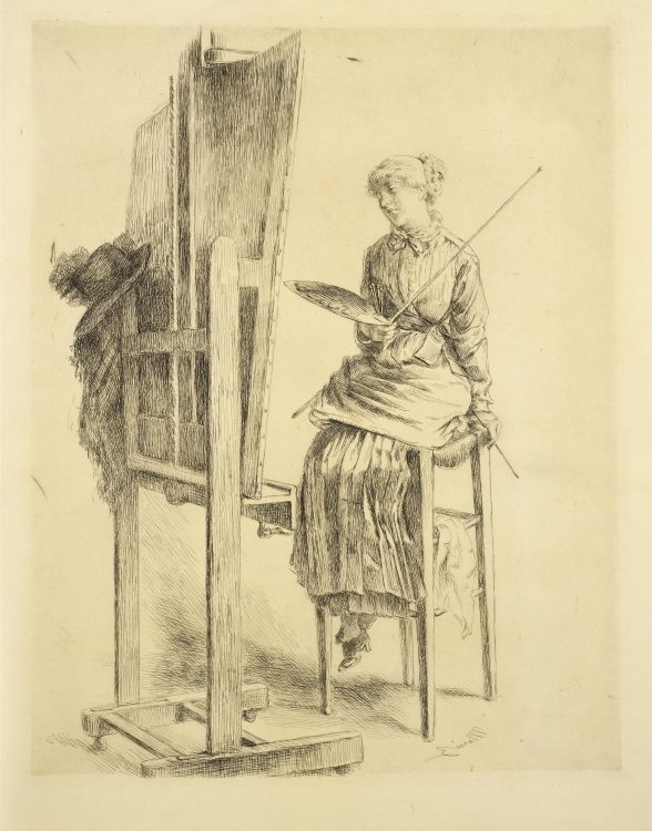 There are comparatively fewer women printmakers of this period, with a notable exception in Marie Bracquemond, who likely learned the technique from her husband Félix. A counterpoint to Marie’s own A woman artist at her easel, Félix’s etching La Terrasse depicts her at work at their home in Sèvres. Berthe Morisot also created a group of drypoints in 1889, including a delicate self-portrait drawing with her daughter Julie.